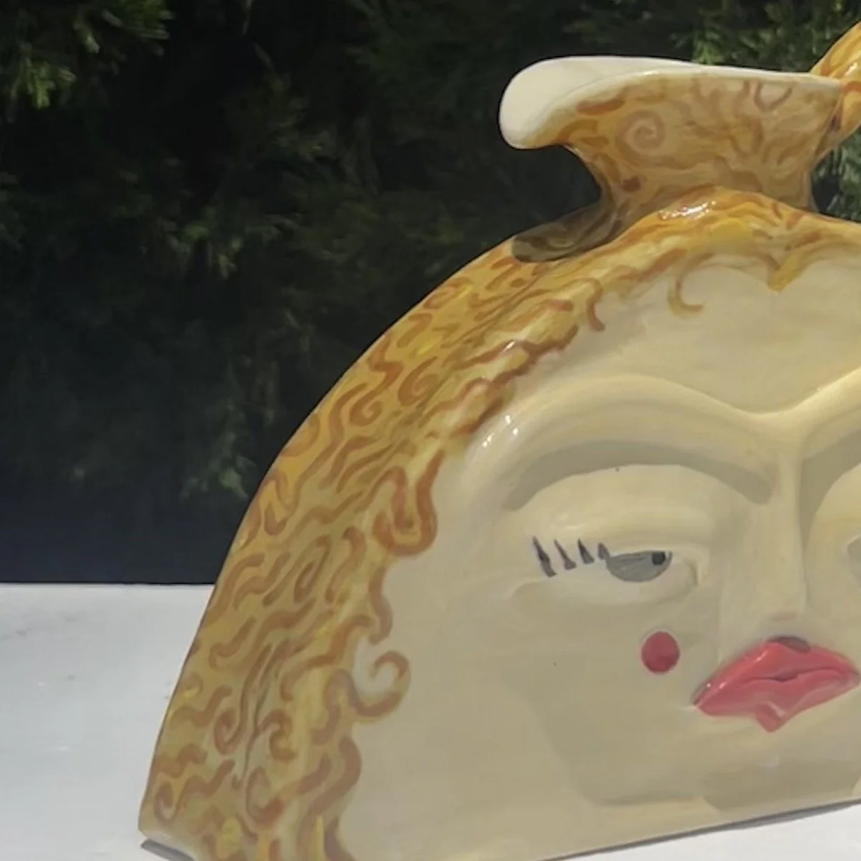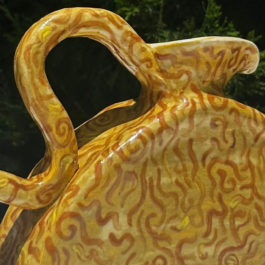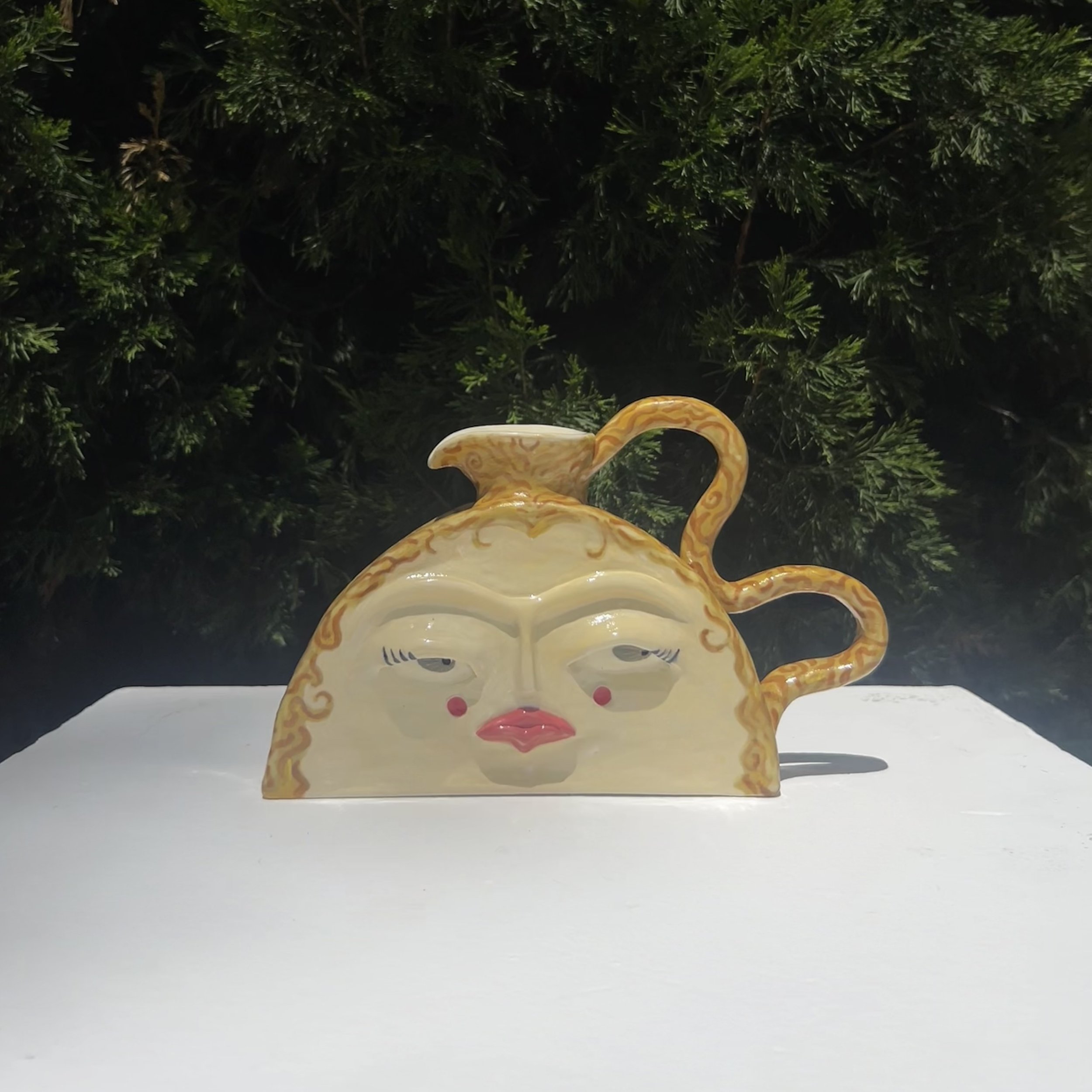 The design on this piece was shaped into the front panel using thin coils and shaping techniques to depict a common facial expression of my childhood, grumpy.